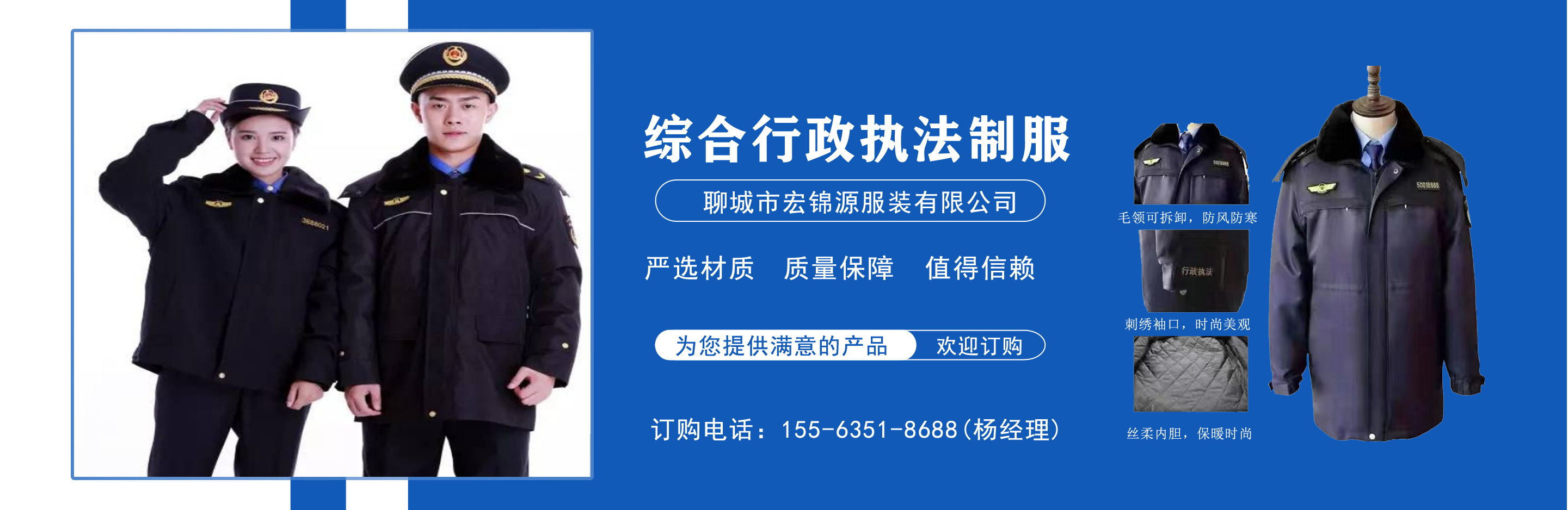 聊城市宏錦源服裝有限公司位于江北水城—山東聊城,地理位置優(yōu)越,交通便利。公司主營綜合行政執(zhí)法制服,交通執(zhí)法服裝,應(yīng)急管理執(zhí)法標志服,市場監(jiān)督管理標志服,農(nóng)業(yè)執(zhí)法服裝,生態(tài)環(huán)境保護制服,文化市場執(zhí)法服,城管標志服裝廠,衛(wèi)生監(jiān)督制服,六部門標志服廠家等,值得信賴! 公司生產(chǎn)的標志服裝據(jù)有造型美、板型新、多次水洗不退色、不變型、不起泡。 “認真辦事,踏實做人”是宏錦源的企業(yè)精神,我們的宗旨是:“用服務(wù)與真誠來換取你的信任與支持,互惠互利,共創(chuàng)雙贏!”我公司愿與國內(nèi)外各界同仁志士竭誠合作,共創(chuàng)未來企業(yè)目標:在已選定的服飾領(lǐng)域中,成為行業(yè)的卓越者。 經(jīng)營理念:追求產(chǎn)品卓越,為用戶提供完美、高效的服務(wù)。...